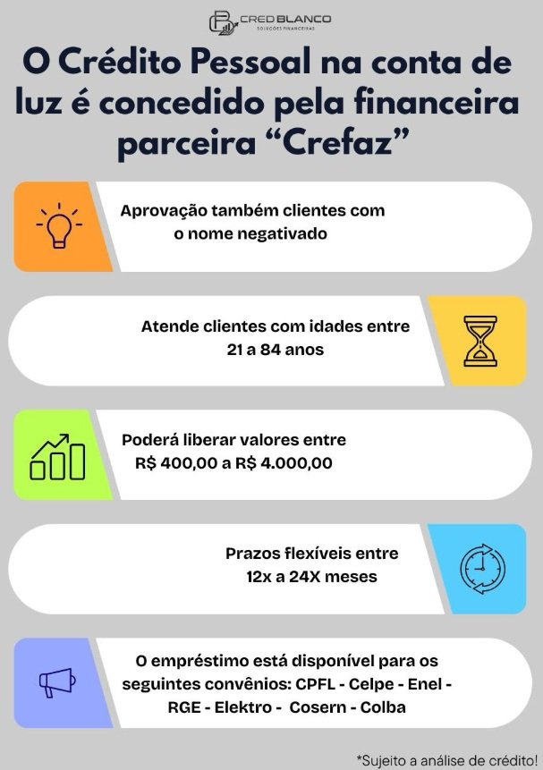 Empréstimo pessoal com facilidade de liberação sem necessidade de comprovar renda, as parcelas são integradas na fatura de energia com parcelas de até 22x é necessário ter acima de 21 anos, e algumas companhias de energia elétrica libera até R$3.300 para o titular da fatura em até 1 dia útil. (Verificar se sua cia de energia é conveniada). *Sujeito a análise.